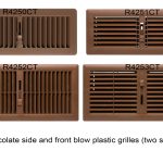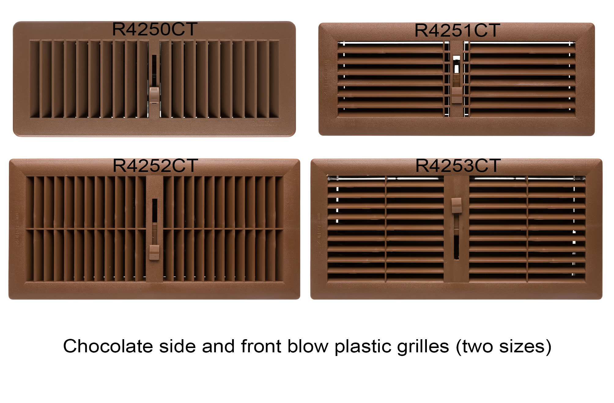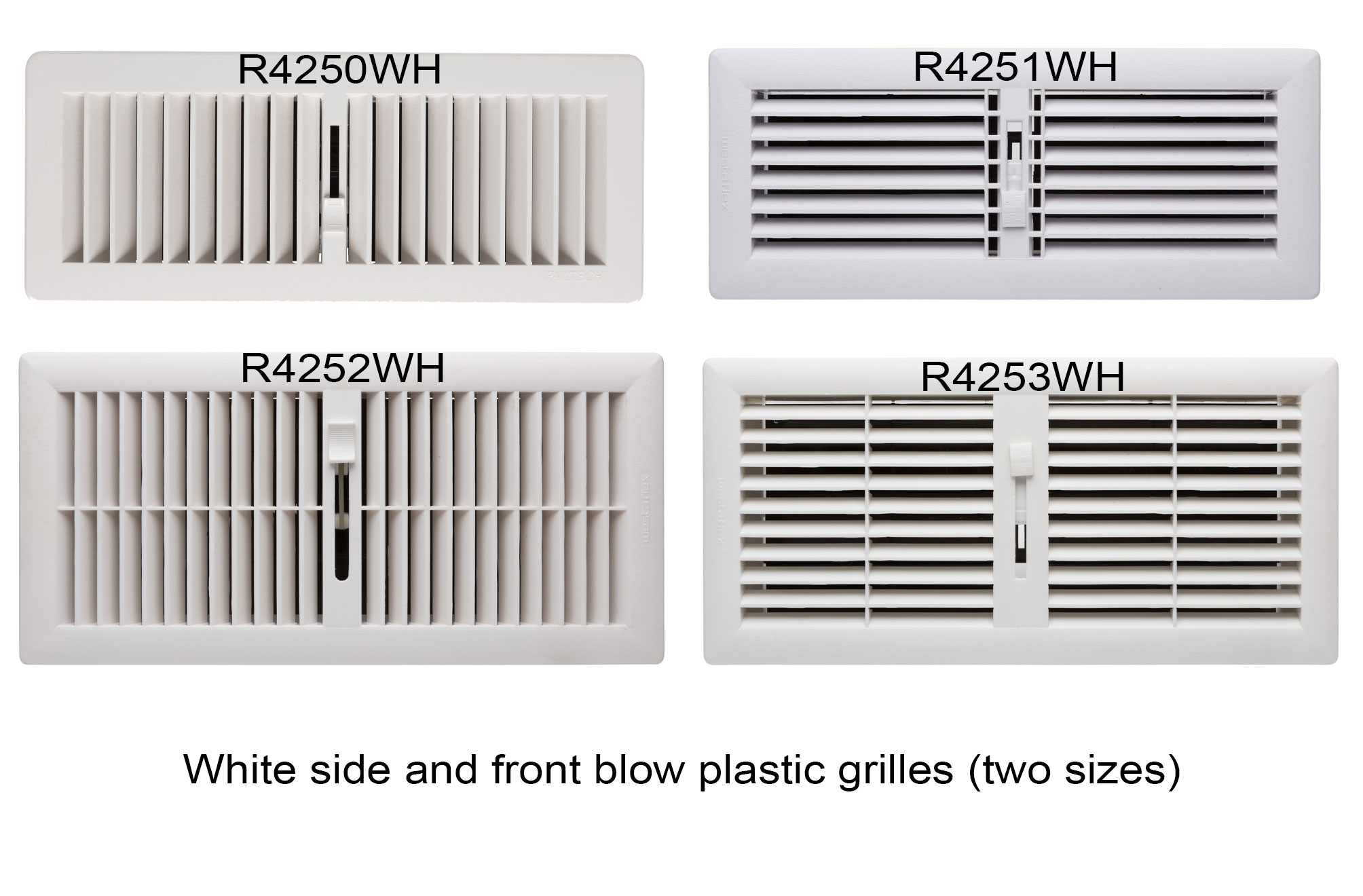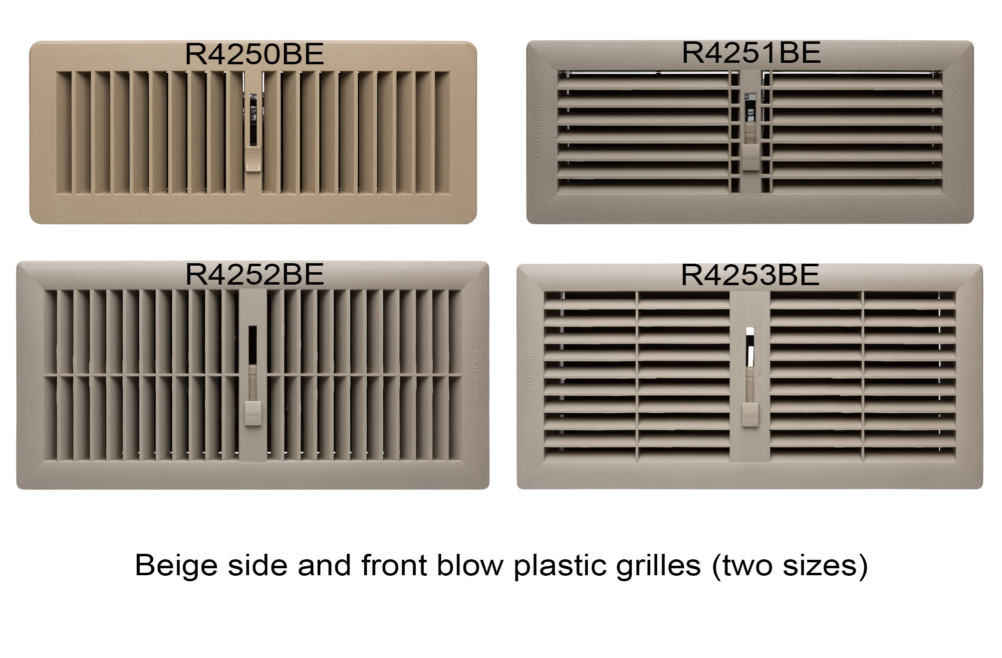 Manufactured from fire retardant, V-2 polycarbonate plastic, these floor grilles have been designed and built to withstand high traffic areas. Available in two different styles and sizes. Side blow is the most popular, although, where curtains get in the way of the vent or where it is placed next to a fixture, the front blow may be the better option.