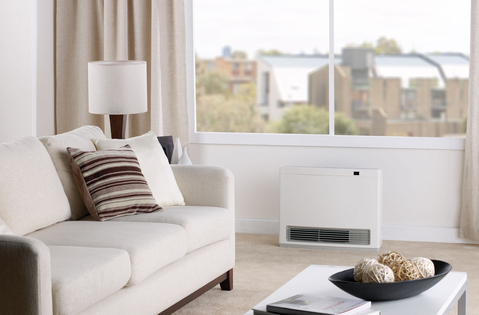 Residential and commercial heating suitable for open plan areas. Room sizing in important. These heaters modulate to a low setting and do not turn off. It is important that the room is of a sufficient size that it will not overheat when the heater is on low—refer minimum room sizes are detailed below.